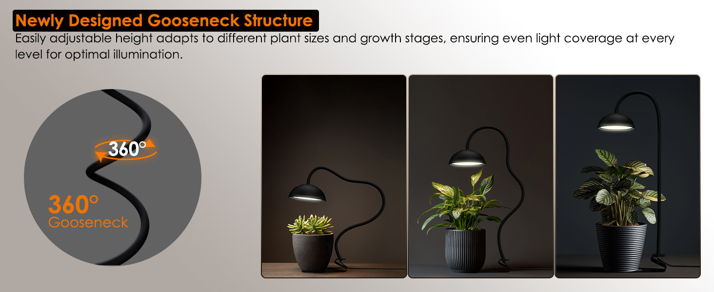 With an adjustable height of 7.8–17.7 inches and 360° positioning, the gooseneck lamp delivers targeted light exactly where your plant needs it — no wasted beams. The sleek metal base offers firm anti-slip stability, blending seamlessly into home or office décor. Compact, sturdy, and stylish — a space-saver that doubles as modern décor.