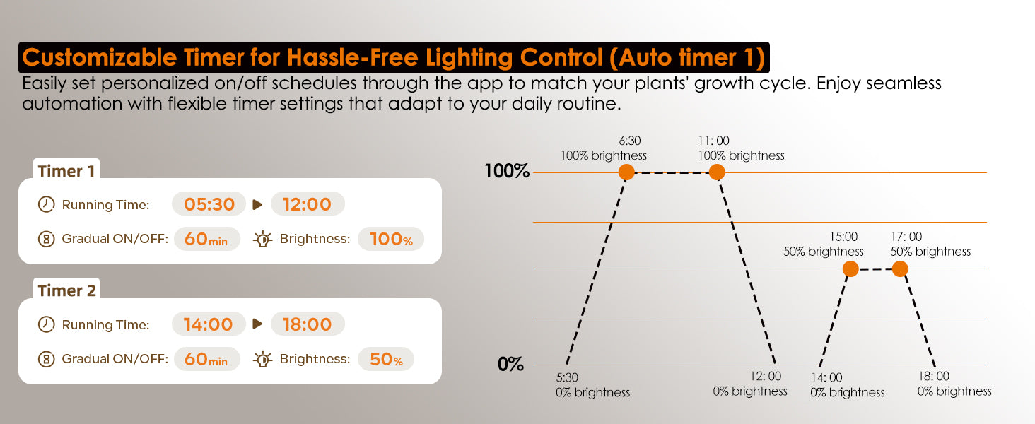 Forget manual switches — just set it once in the app. With dual-phase custom scheduling and Sun-Sync mode, the lamp automatically mimics natural daylight patterns, ensuring plants thrive even when you’re away. Perfect for frequent travelers or forgetful plant parents — your plants never miss a sunrise.