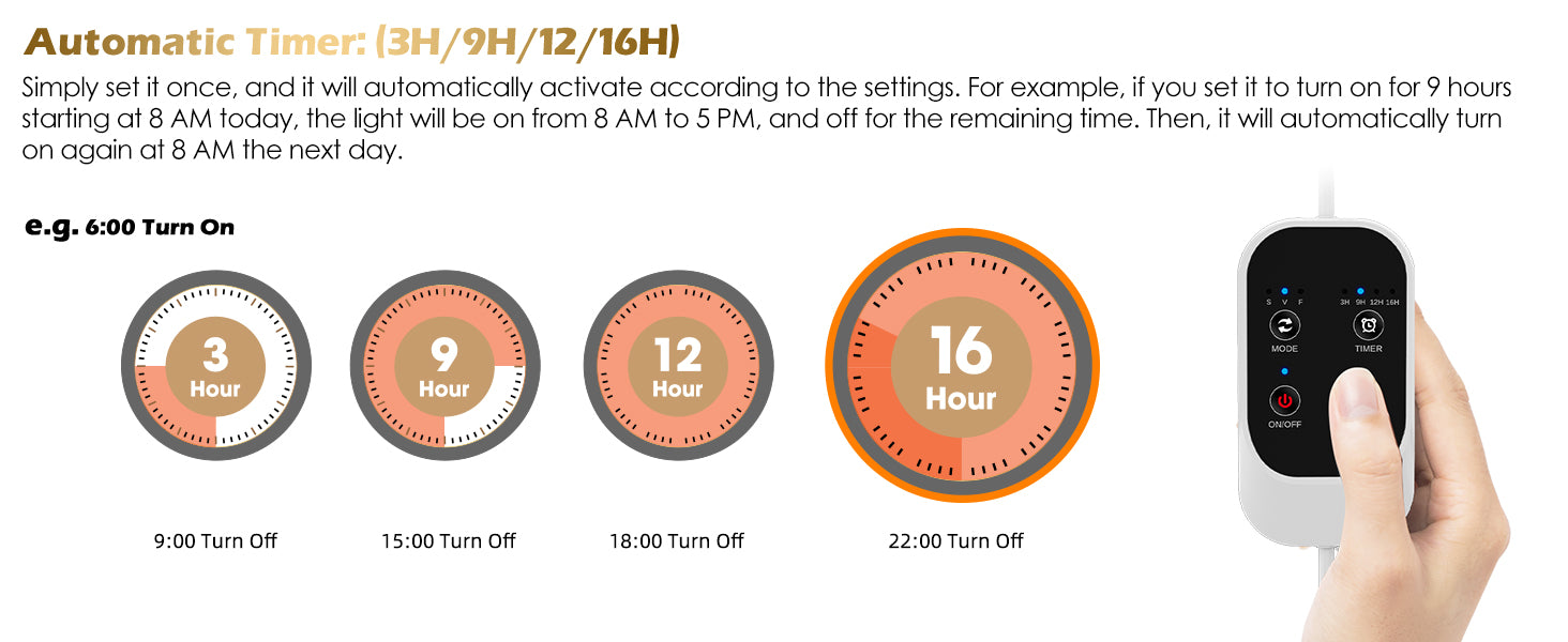 With 3H/9H/12H/16H timer options, your plants get consistent light every day—whether you’re at work or on vacation. Just set it once and the light will turn on and off automatically—more tomatoes, greener vines, and zero stress about forgetting to switch the light.