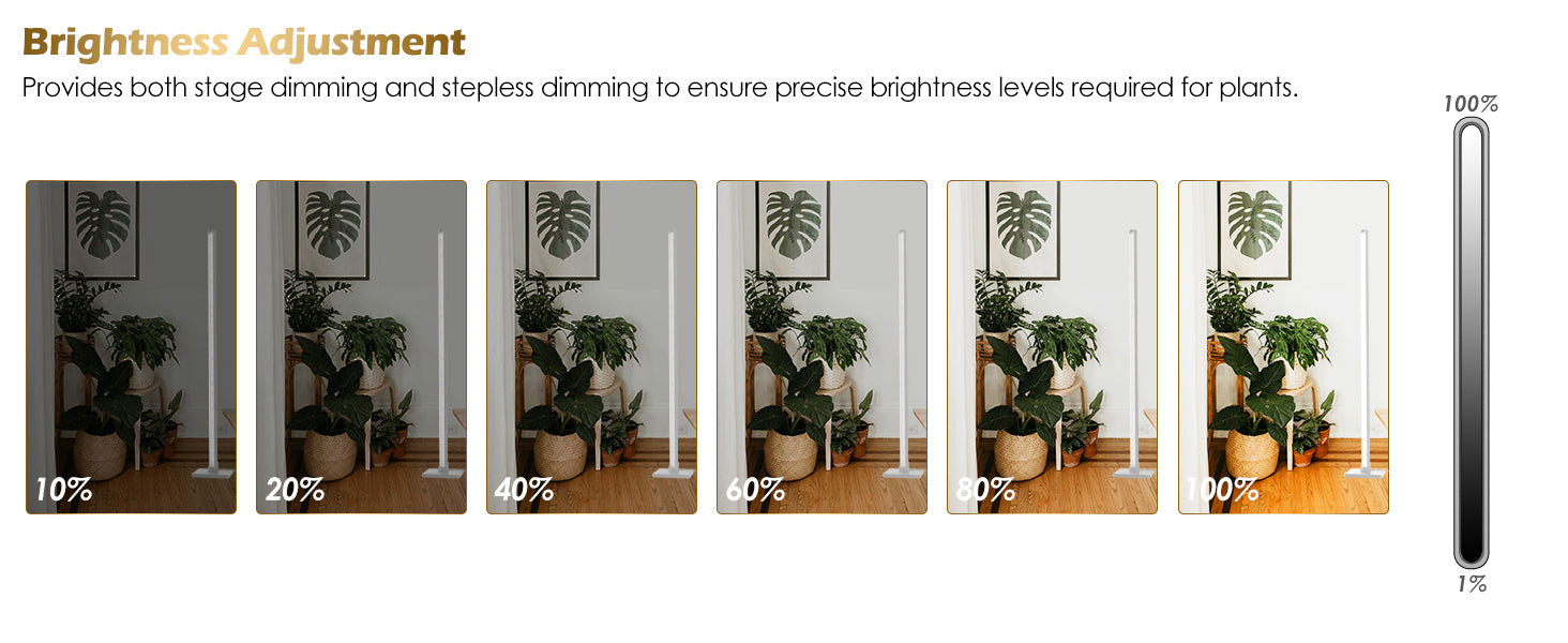Unlike traditional grow lights that only shine from the top, our Vertical Grow Light uses the latest side-lighting technology to deliver 120° lateral illumination. This ensures even light from top to bottom—no more “bright crown, dark bottom.” Your monstera grows straight, your herbs stay compact, and every plant looks perfectly shaped with minimal effort.