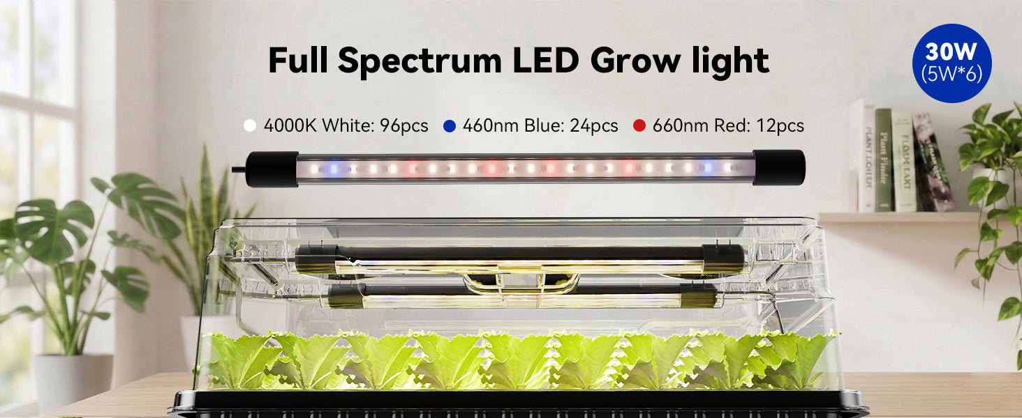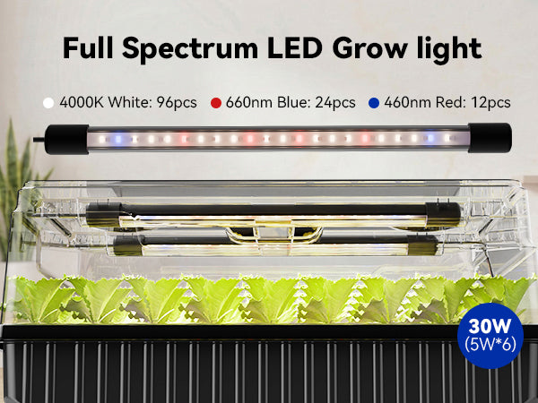 Stop leggy growth for good. Our 6*5W LED bars (30W total) pack the punch your sprouts need, delivering sun-like light for thick stems and vibrant green leaves.