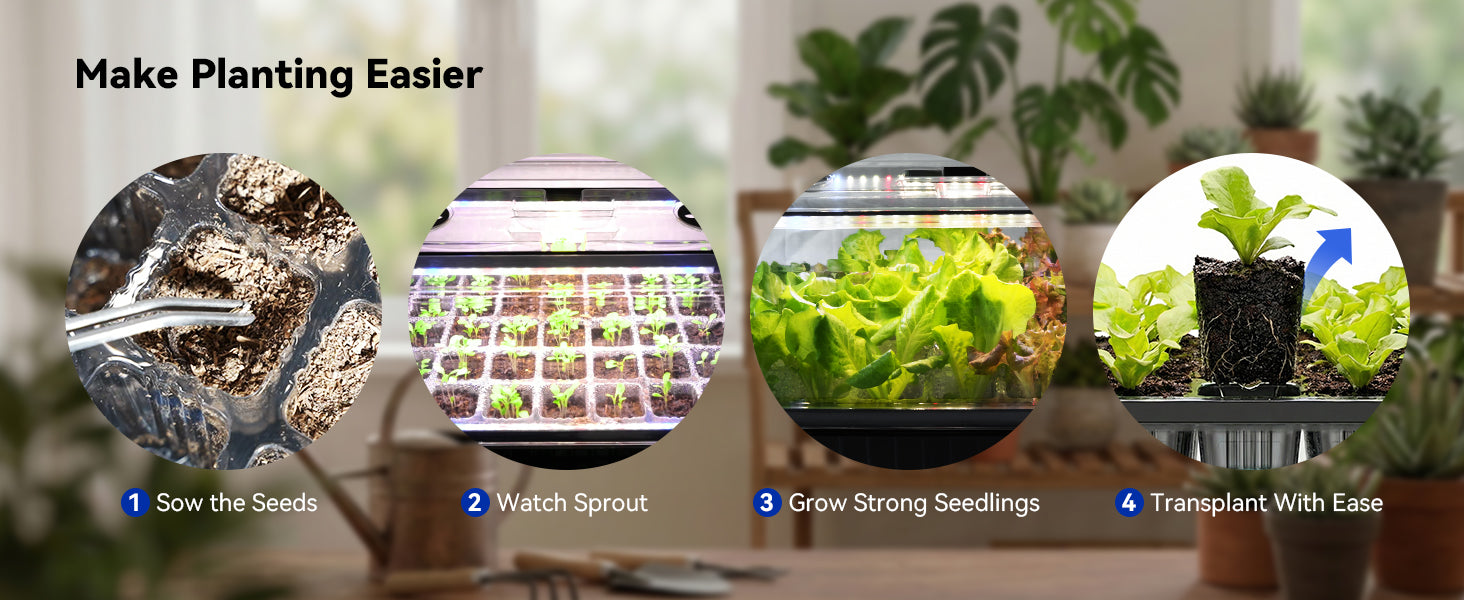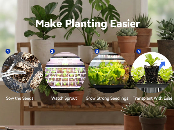 Dial in the perfect glow: Levels 1-2 (Germination), 3-4 (Sprouting), and 5-6 (Growth). The self-watering tray keeps soil moist, so you can enjoy zero-hassle gardening.