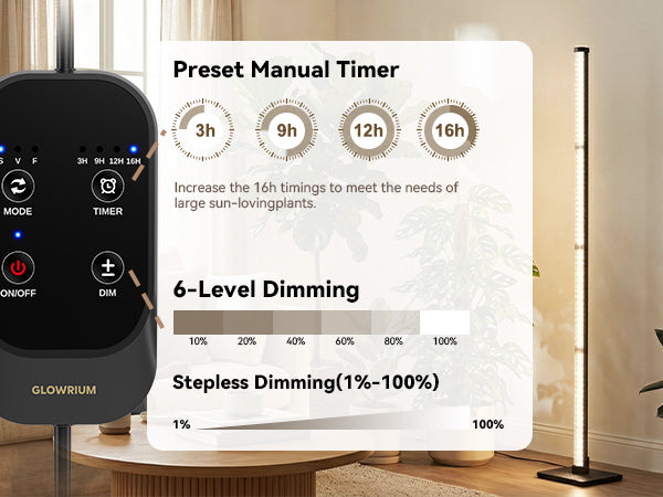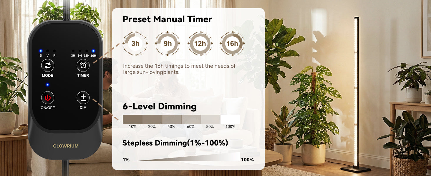 Choose 3/9/12/16H timer and 10%–100% brightness. Set it once to mimic a natural sun cycle—even when you're away on vacation.