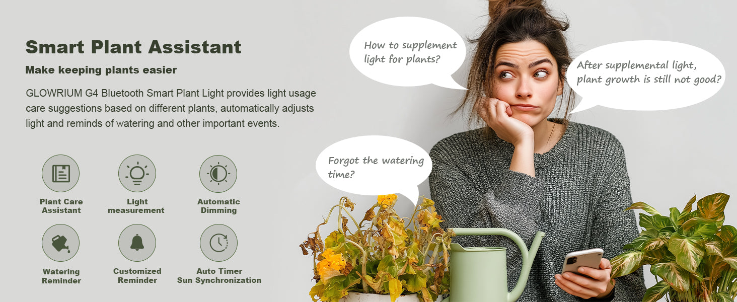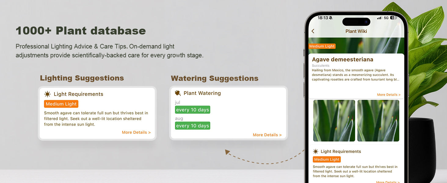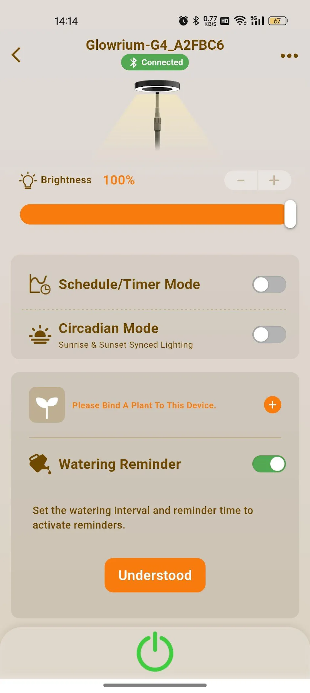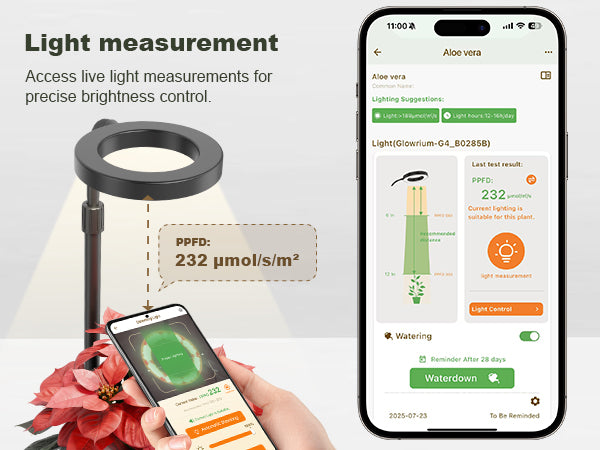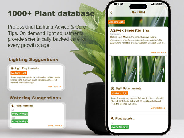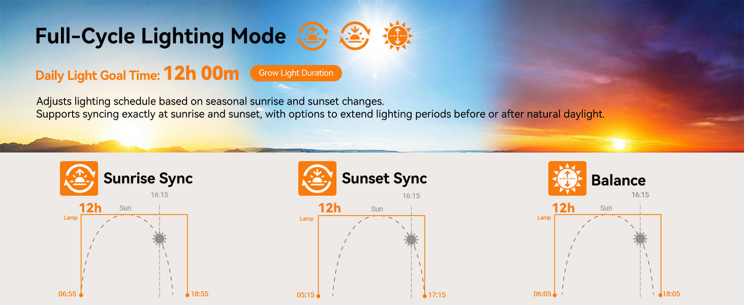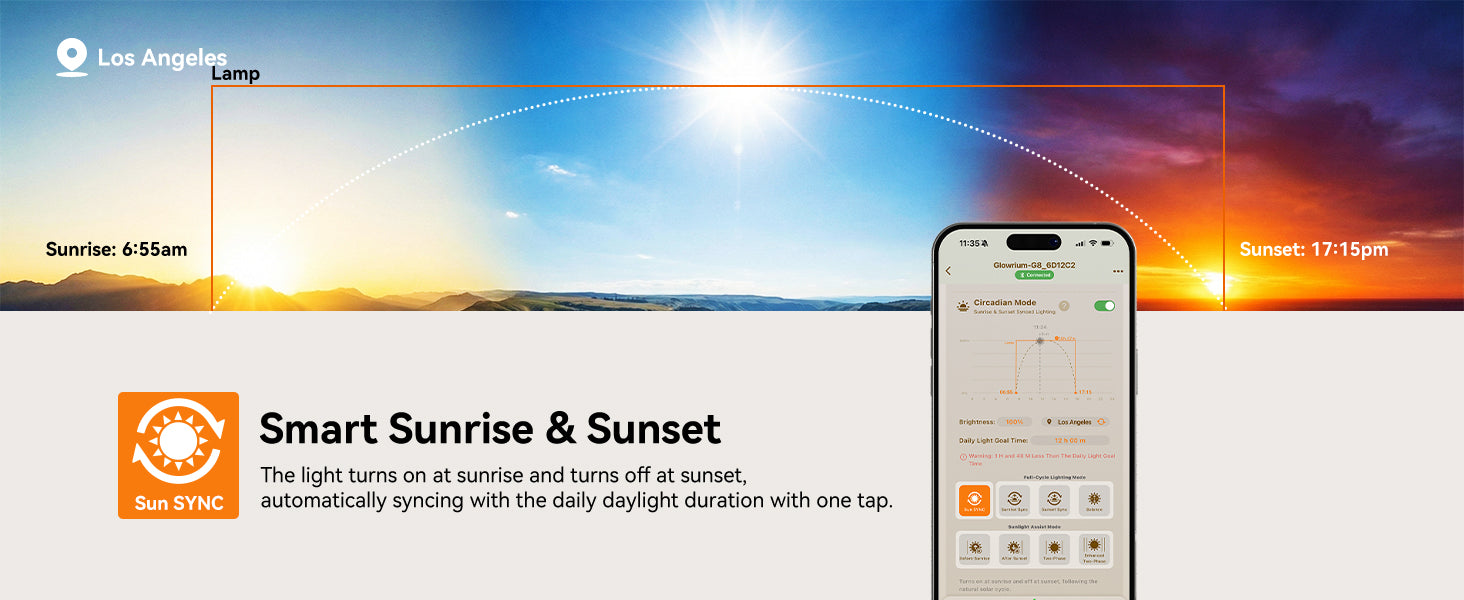 Circadian Mode follows real local sunrise and sunset — no manual scheduling needed. The app also sends watering reminders and dialing in the right settings for whatever you're growing.
