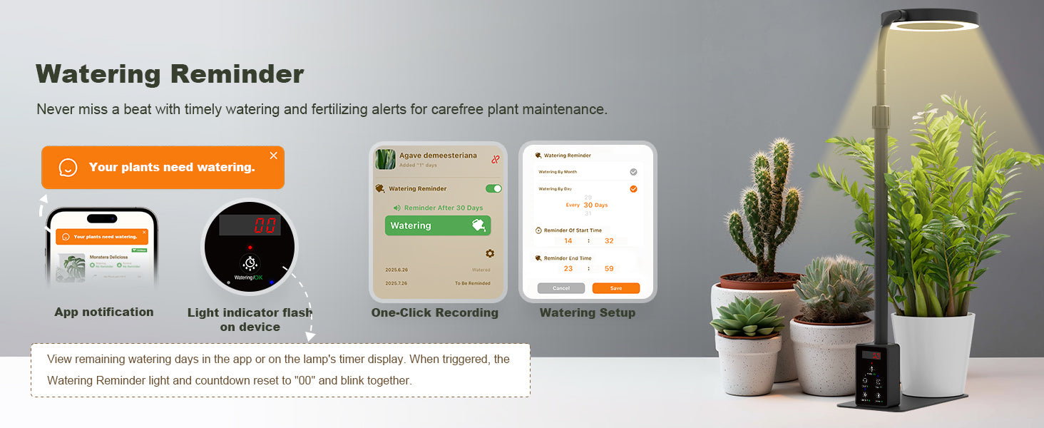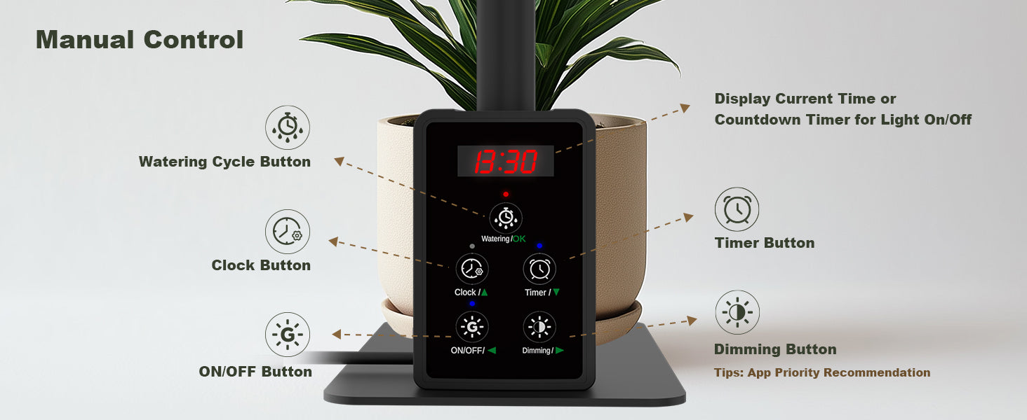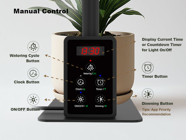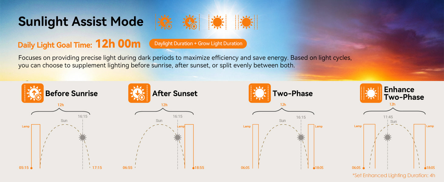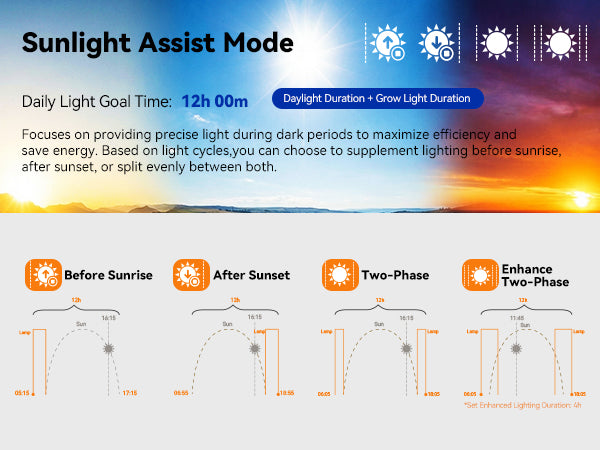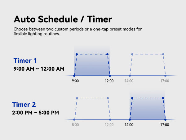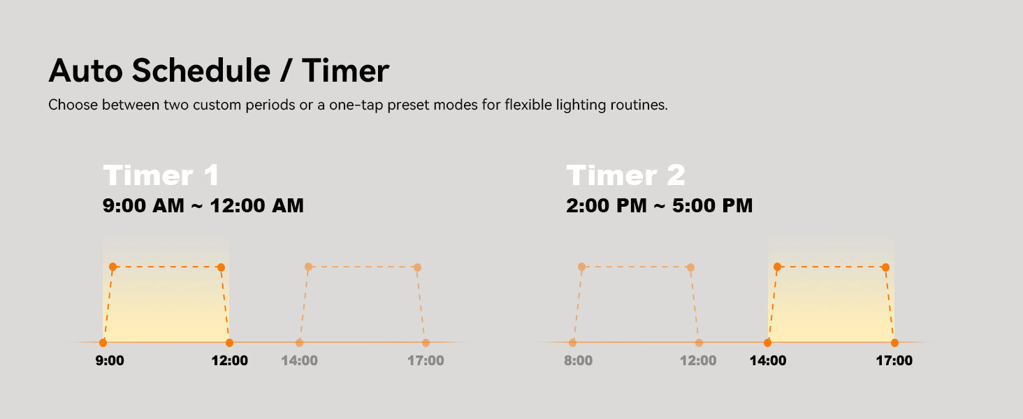 Run one light period or break it into two — whatever fits your routine. The light eases on and off gradually, so your plants get a natural sunrise and sunset instead of a jarring on/off switch.