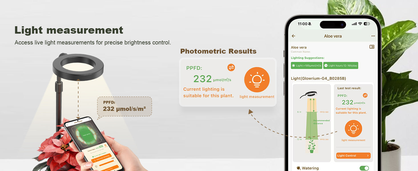 210 µmol/m²/s at 6" with a 120° beam. The 4000K White + 660nm Red combo covers everything from seedlings to flowering — great for herbs, tropicals, and leafy greens.