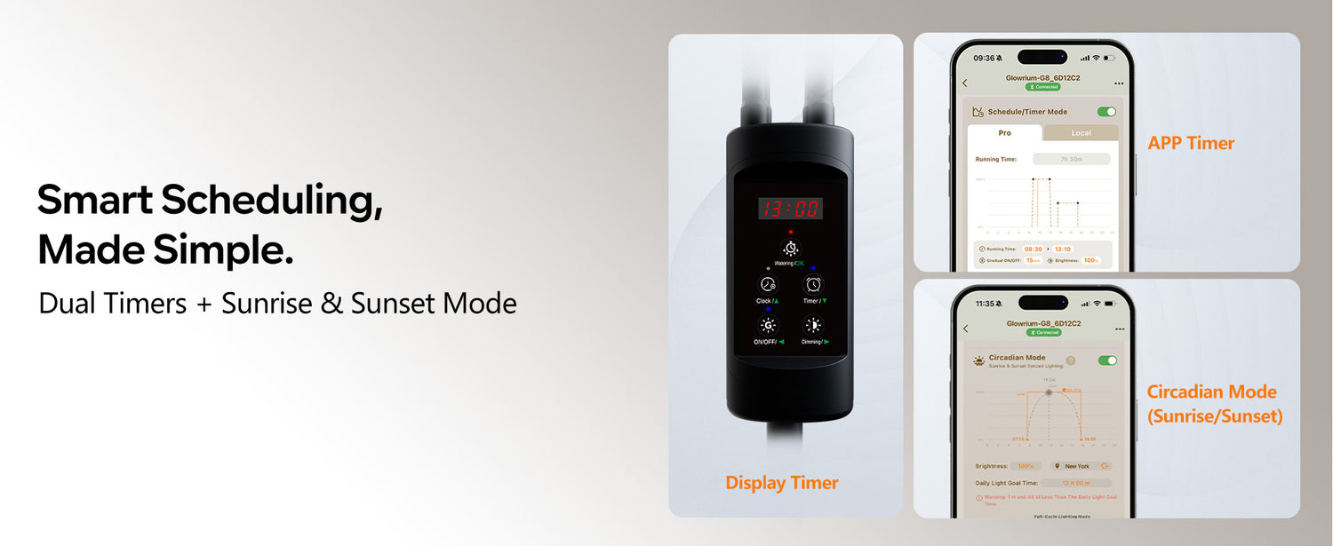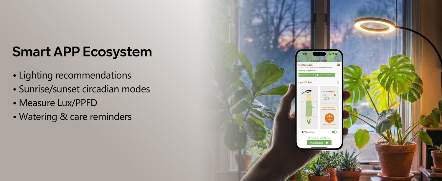 Circadian Mode tracks your local sunrise and sunset—schedule adjusts automatically as seasons change. Get watering reminder, Lux/PPFD measurement, and lighting suggestions for your plants—perfect for busy plant parents.