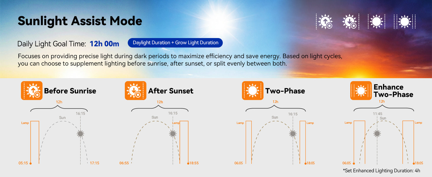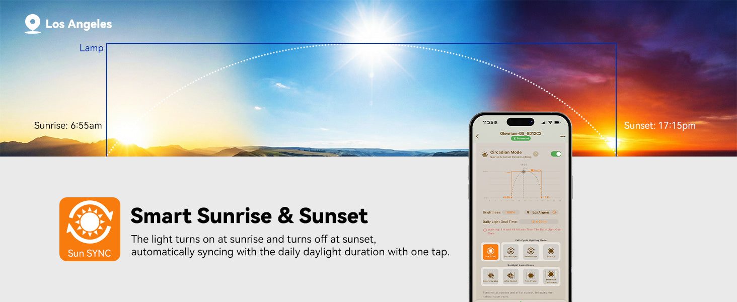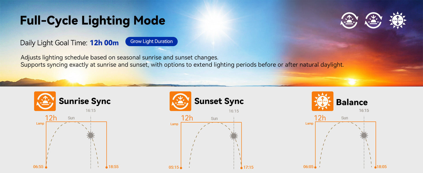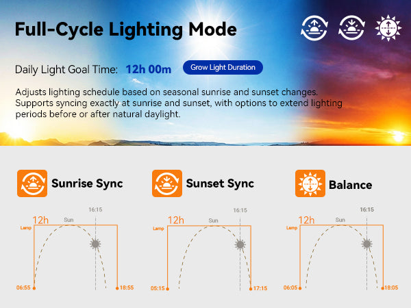 A: Circadian Mode syncs your grow light with natural sunrise and sunset in your area—just like how plants grow outdoors.If your plants are near a window, it adds light before sunrise or after sunset when needed. If they're in a dark room, it creates a full day-night cycle. Either way, your plants get consistent light that follows the sun's rhythm instead of a rigid timer.This prevents common problems like leggy, stretched growth from too little light, and helps plants develop stronger stems and better flowering.