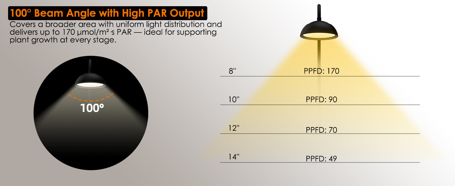 Powered by 32 professionally calibrated LEDs (4000K white + 660nm red), this grow light delivers a high PPFD of 170 μmol/m²/s at 8 inches — strong enough to fuel photosynthesis at every stage. Whether it’s leafy greens, aromatic herbs, or flowering plants, one lamp covers the full cycle — boosting leaf growth, fuller blooms, and juicier fruits without the guesswork.